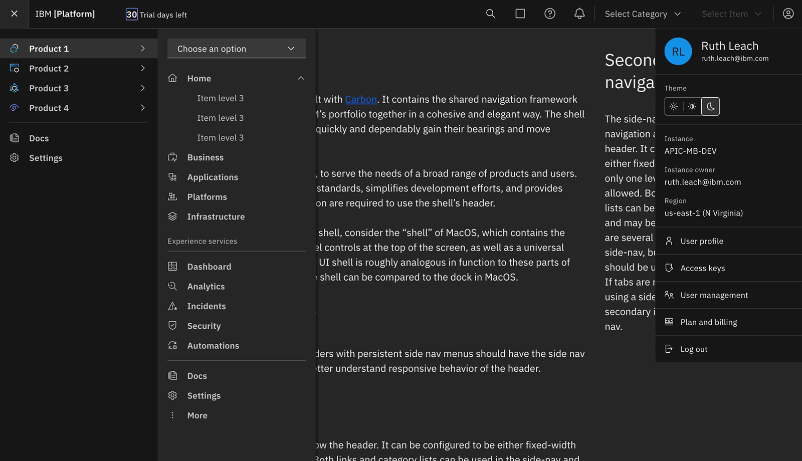 The Carbon UI Shell was expanded and enhanced in Carbon Labs to create a consistent, unified experience across IBM Software. Building on the existing shell, the work added new React components where gaps existed and aligned diverse business needs into shared patterns.